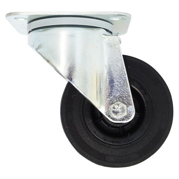 Industrihjul med svart gummibane med rullelager i hjul. Holder av forsinket stålplate, dobbelte svingkranslager med tetningsbeskyttelse for smuss.