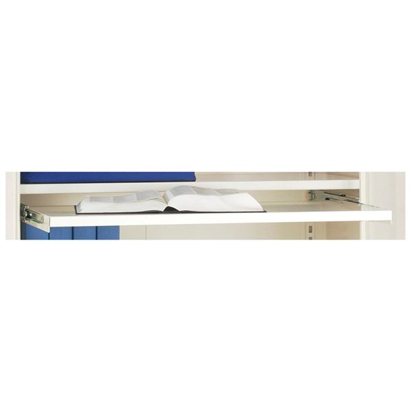 Uttrekkbar hylle til metallskap MF4. Metallskapet kan innredes med hyller, uttrekkbare hyller og skuffer, verkstedspaneler og opphengningslist for plastrygger. Hyllene tåler 100 kg jevn belastning.