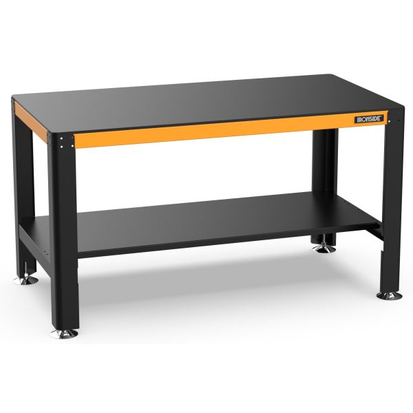 Arbeidsbord med kraftig konstruksjon, 3 mm materialtykkelse inkludert bunnhylle. Plastplate for å beskytte benkeplaten medfølger. Justerbare ben i høyden.