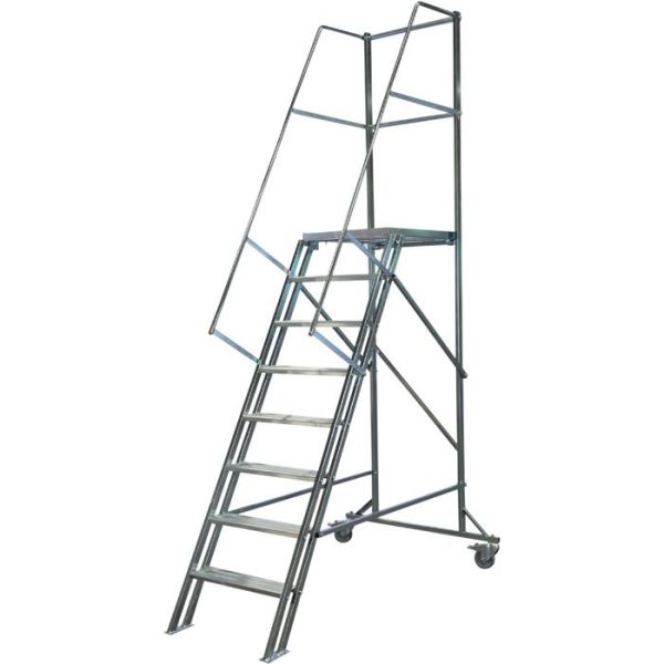 Mobil trapp med låsbare hjul, rekkverk og arbeidsplattform på 500x600 mm. En stabil og sikker arbeidsplass over bakken. Trappen flyttes enkelt ved hjelp av svingbare og låsbare hjul på bakstaget. Trappen leveres i sammenfelt, men monteres enkelt med fire bolter. Trappens trinn og plattform er produsert i aluminium og rammen i galvanisert stål.