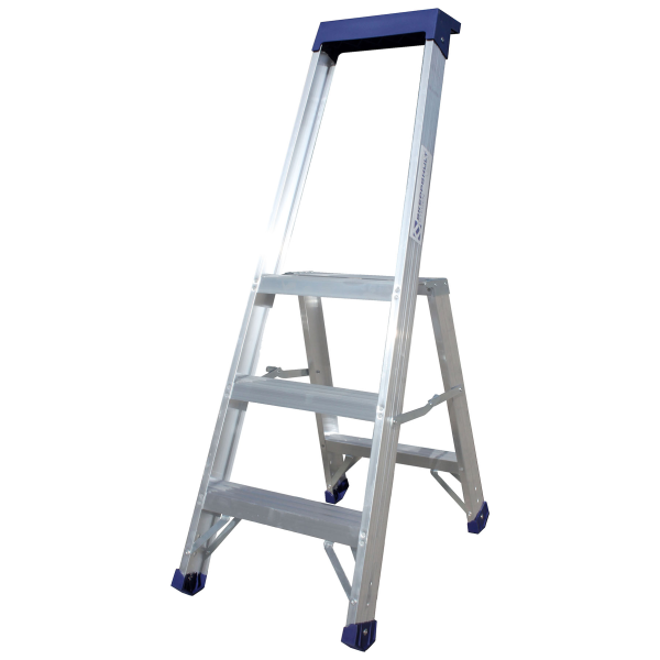 Stabil og robust trappestige i aluminium som tåler tøff bruk. stigen har hydrauliske steg,en stabil plattform og en hylle. Dimensjonene på plattformen er 375 x 250 mm og skrittdybden er 81 mm. Stigen er utstyrt med plastføtter som gir god sklibeskyttelse samtidig som overflaten beskyttes.