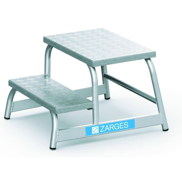 Lav vekt, høy stabilitet og behagelig arbeidsflate. 200 mm dype trinn av sklisikker, riflet aluminiumsplate. 350 x 577 mm stor plattform som er forsterket av en tverrbjelke. Fjærbremsehjul kan fås som tilbehør fra to trinn. Leddstang fås som tilbehør fra tre trinn. Iht. standarden EN 14 183.