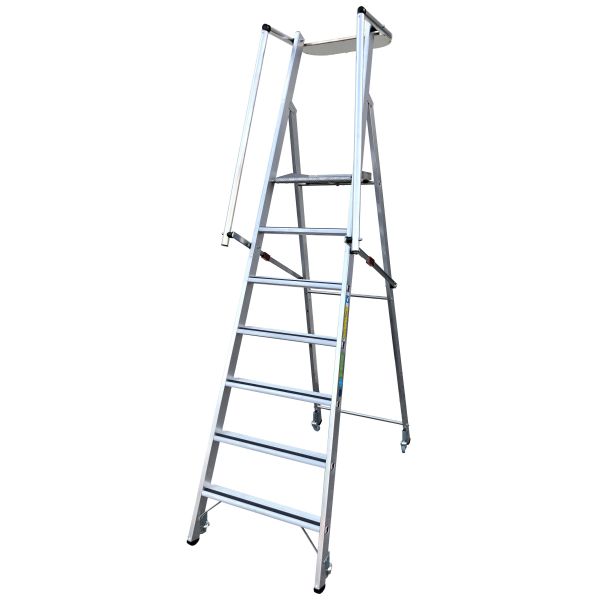 Ekstra stor arbeidsplattform 400 x 400 mm. Rekkverk på tre sider og oppbevaringshylle for verktøy og smådeler. 80 mm dype trinn med integrert sklisikring. Utstyrt med fjærbelastede hjul for enkel transport fra punkt A til punkt B. Ved påstigning fjærer hjulene opp og man står sikkert!