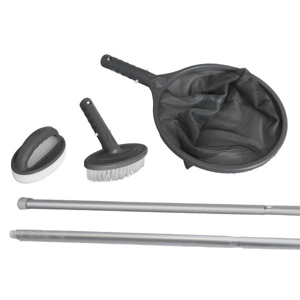 Sett som inneholder rengjøringstilbehør som trengs for å holde spaet rent og innbydende. Settet inkluderer børstehode, teleskopstang, overflateskummer og rengjøringssvamp.