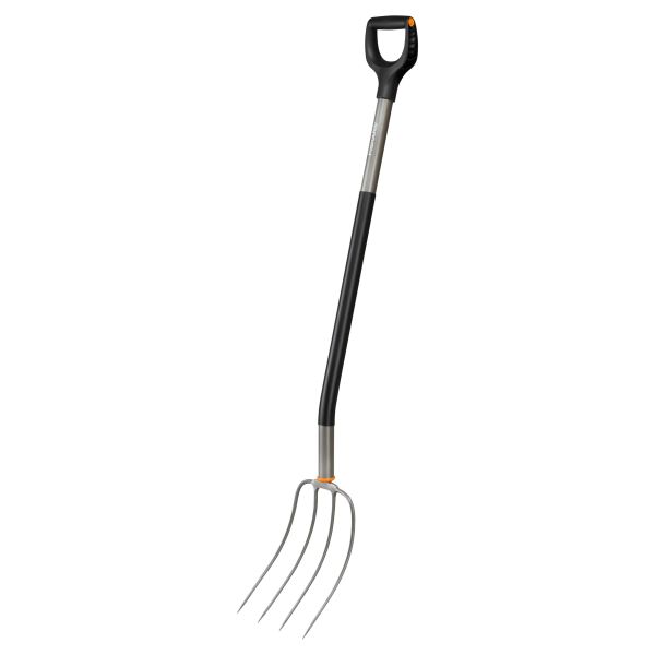 En kompostgreip med tynne, smidde pinner. Er ideell for å flytte store materialer som blader, kompost, høy og kuttet gress.