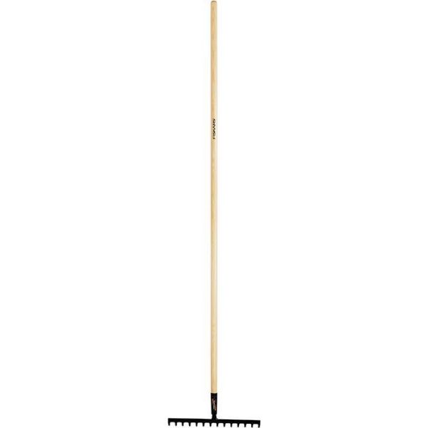 Fiskars 5040 er en rake med bøyde pinner av herdet stål. Total lengde 1640 mm.