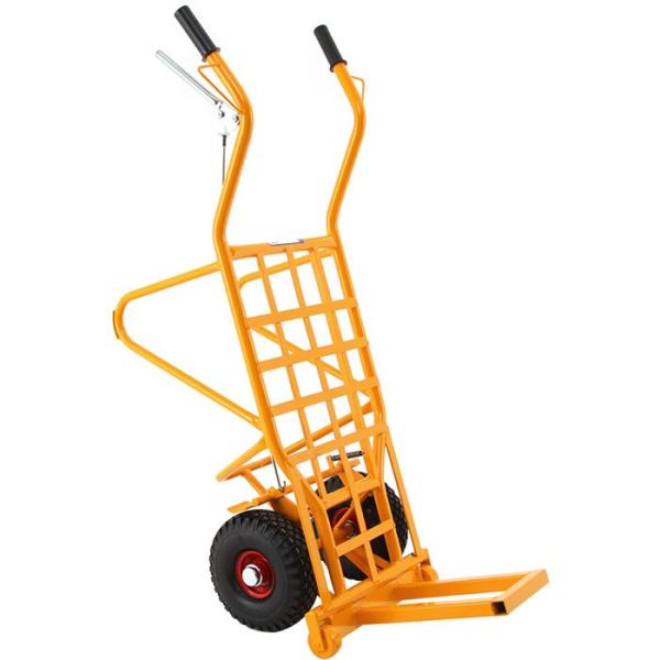 Teglvogn for tunge transporter opptil 600 kg. Med fast bøyle, knokebeskyttelse, fotbøyle og selvregulerende brems.