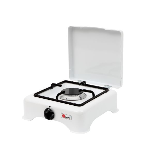 Frittstående emaljert gasskomfyr. Lokket beskytter veggen bak mot fettsprut. Tennsikringen sørger for at gasstilførselen automatisk stenges dersom flammen slukker.