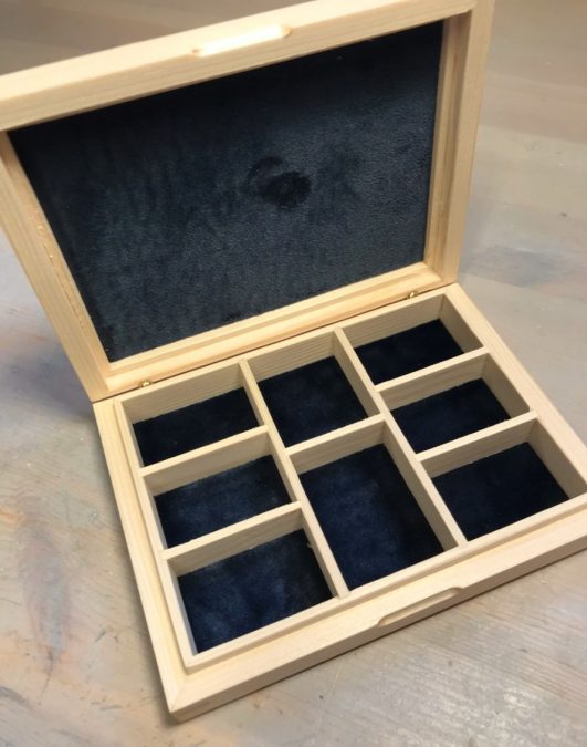 “Jeg har laget et sortimentskrin / smykkeskrin av 2×4’’ gran – med hengsler og innredning i stoff. Teksten på lokket har jeg gravert med en cnc maskin.”