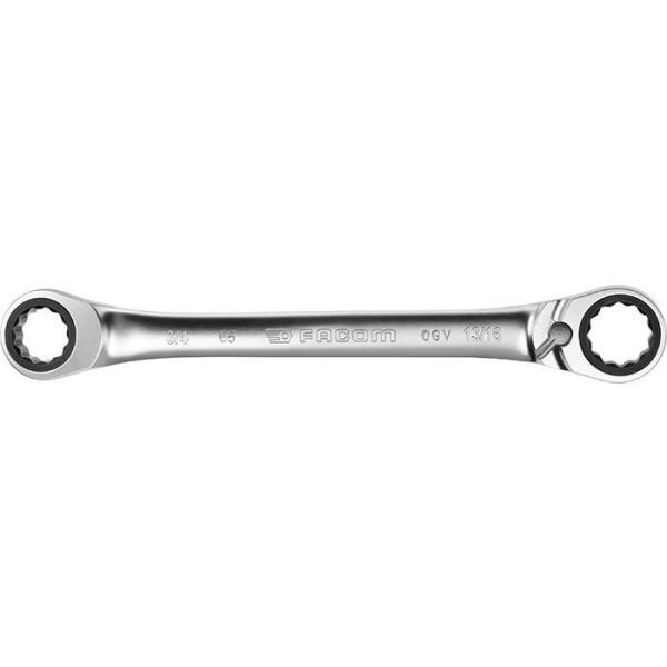 Facom 65.3/8X7/16 er en ringnøkkel med sperre. Nøkkelen er vinklet 15° med nøkkelvidder på 3/8" og 7/16".