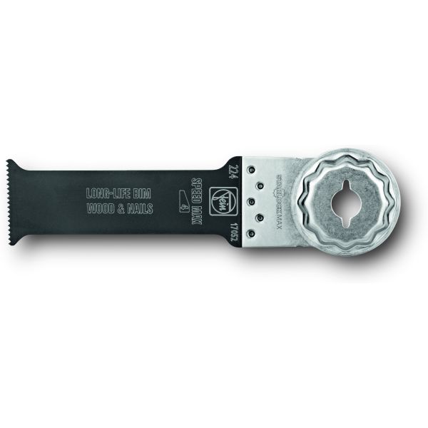Sagblad i bimetall, med skråstilt tanning for alle tre-, gips- og plastmaterialer. Sagbladet har svært lang levetid, høy snittkvalitet og god avvirkning. Sagbladet er svært robust og tåler spiker (opp til ca. Ø4 mm) som måtte finnes i treet. Den ekstra lange, smale formen er egnet for store innstikksdybder og spesielle oppgaver, f.eks. utskifting av vindu. Sagbladet har også innsvingt form for optimal avvirkningshastighet og god spontransport.