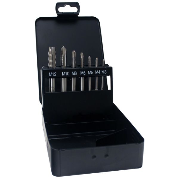 Gjengetappsett i 7 deler. HSSG DIN-13/B ISO529 M3 – M12. Leveres i svart plasteske med 7 stk gjengetapper M3, M4, M5, M6, M8, M10 og M12.