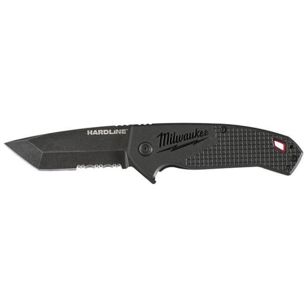 Milwaukee 48221998 Hardline er en foldekniv med et tagget 75 mm blad med spiss.