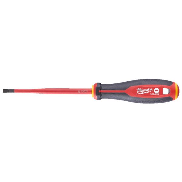 Milwaukee Tri-Lobe VDE er en skrutrekker som er VDE-testet til 10 000 V og garantert til 1000 V. Skrutrekkeren har en smal akseldiameter for tilgang til lavtliggende skrueapplikasjoner og et praktisk Tri-Lobe-håndtak som er optimert for maksimal brukerkomfort og applikasjoner med høyt dreiemoment. Verktøyet har permanent synlige ID-markeringer for rask verktøyidentifikasjon og hull for verktøysikring. Håndtaket er 3-sidet for å forhindre rulling.