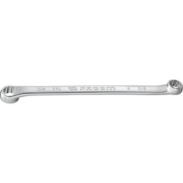 Facom 56L.7/16x1/2 er en lang ringnøkkel bøyd 10° med gripevidde på 7/16" x 1/2" og tolvkantringer med OGV-profil for kraftig tiltrekking.