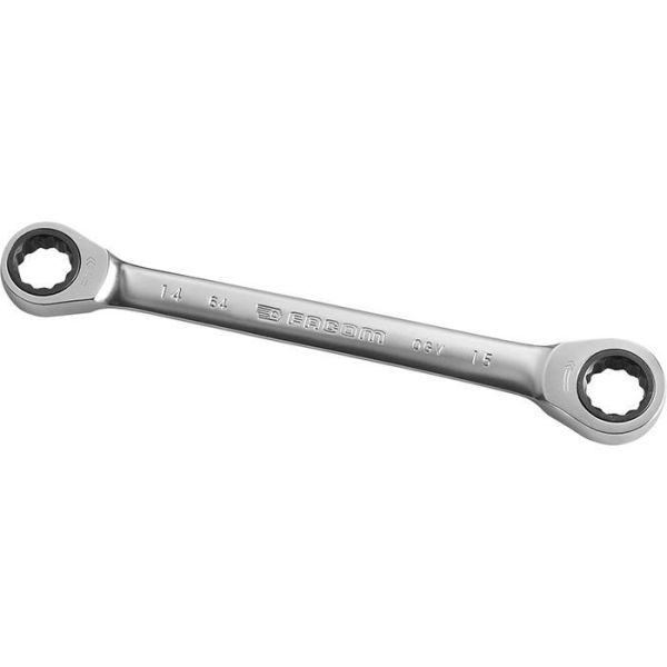 Facom 64.14X15 er en rett ringnøkkel med sperrefunksjon med dimensjonene 14 mm og 15 mm. Omtaksvinkel på 5°.