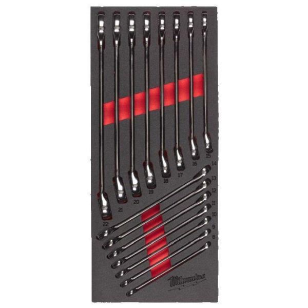 Kombinasjonsnøkkelsett som inneholder 15 stykker nøkler i størrelsene 8-22 mm med MAX BITE åpent grep som reduserer avrunding og stripping. Nøklene har avrundede I-Beam-håndtak for komfortabelt grep og 15° forskyvning for bedre tilgjengelighet. Laget av forkrommet kromlegert stål.