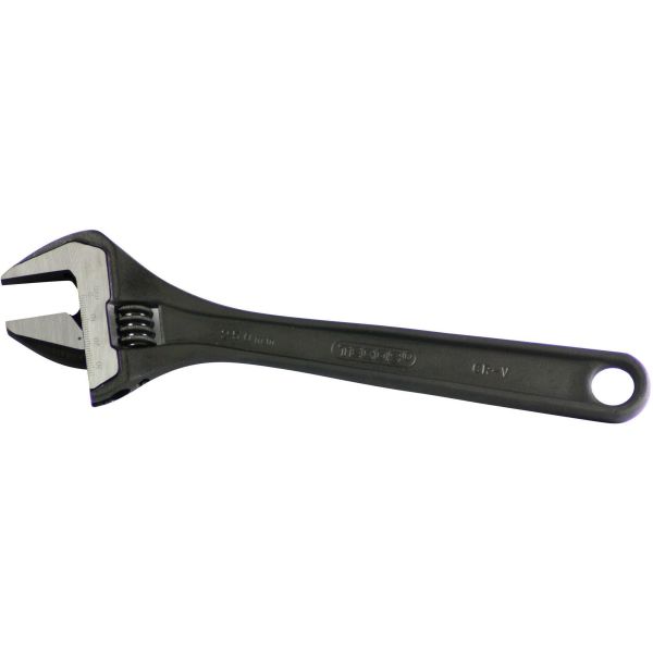 Skiftenøkkel med skala for muttertåke. Laget av Cr-V stål. Svart oksidert overflatefinish. I samsvar med DIN 3117/ISO6787.