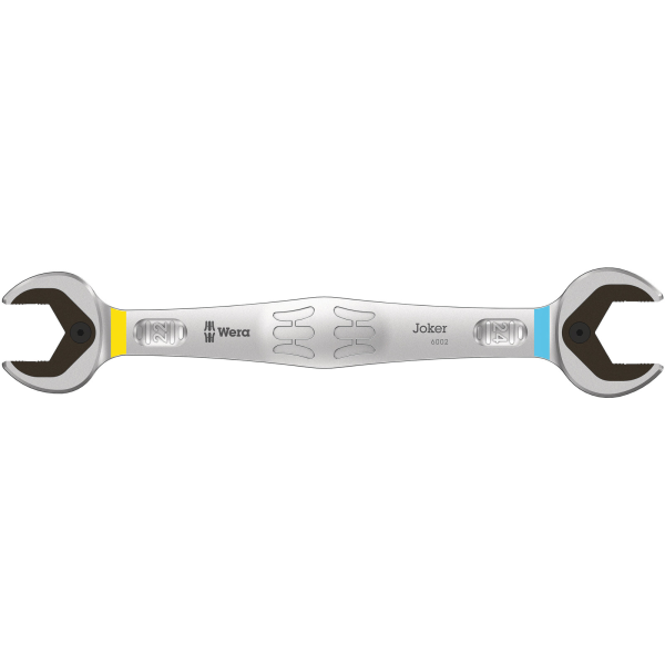 Wera Joker 6002 er en metrisk U-dubbeltnøkkel på 22 x 24 mm som passer for sekskantskruer og -mutre. Med holderfunksjon i form av en metallplate i U-delen, noe som reduserer risikoen for at du mister skruer og mutre. Returvinkelen på bare 30° gjør at man ikke trenger å vri nøkkelen like ofte, og den spesielle, smidde geometrien sikrer høy momentoverføring og høy bøyfasthet.