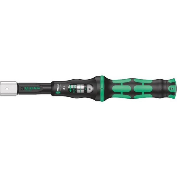 Wera Click-Torque X 1 er en momentnøkkel med holder på 9 x 12 mm for utskiftbare innsatsverktøy og måleområde på 2,5–25 Nm. Nøkkelen har et ergonomisk tokomponenthåndtak for både høyre- og venstretiltrekking. Enkel innstilling og sikring av ønsket momentverdi, med hør- og følbart klikk ved oppnådd skalaverdi.