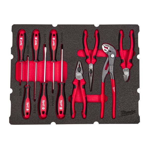 Skuminnlegg til PACKOUT™ oppbevaringsboks. Komfortabelt Tri-Lobe-håndtak optimalisert for maksimal brukerkomfort og applikasjoner med høyt dreiemoment. Permanente synlige ID-markeringer for rask verktøyidentifisering. Herdede magnetiske spisser for maksimalt feste og holdbarhet. Maksimal kraftoverføring for optimal hevarmseffekt for uanstrengt arbeid. Hoveddesign med avrundede kanter for å forhindre håndskader. Premiumskum for lengre holdbarhet, laserskårne størrelser for enkel og rask identifikasjon og rød bakgrunn for enkelt å se manglende verktøy. Polygriptang 250mm (4932492459); kombinasjonstang 180mm (4932492462); spisstang 205mm (4932492465); sideavbiter 160mm (4932492463); TRI-LOBE skrutrekker PZ1 x 100 (4932471791); PZ2 x 125 (4932471793); TRI-LOBE skrutrekkerSL 0.5x3x75 (4932471775); SL 0.8x4x100 (4932471778); SL 1.0x5.5x125 (4932471779); SL 1.2x6.5x125 (4932471781).