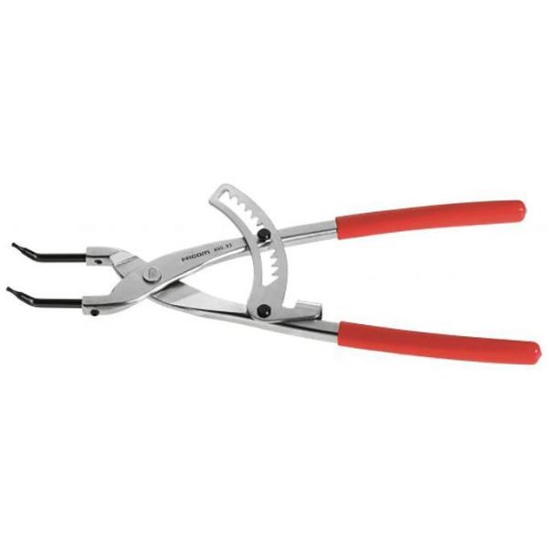 Facom 499.32 er en låseringtang for innvendige løsninger, vinklet 45°. Tangen har en sperre for å holde fast låseringene under innsetting.