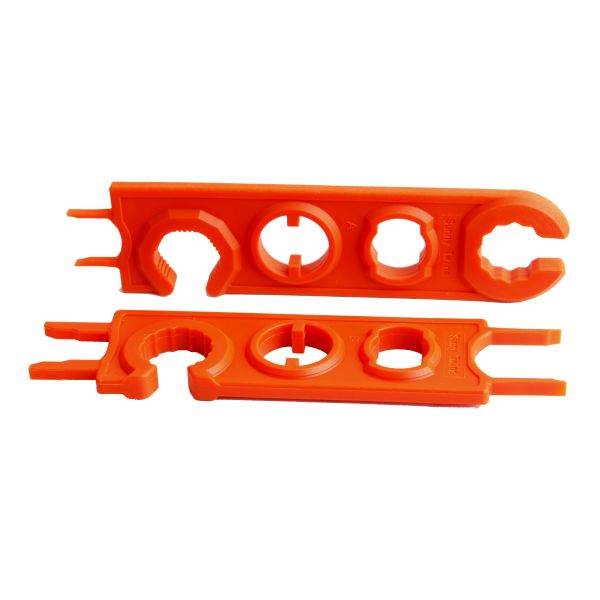 Montasjenøkkelsett bestående av to montasjenøkler for montering og demontering av MC4- og MC4-EVO2-kontakter. Materiale: PA.