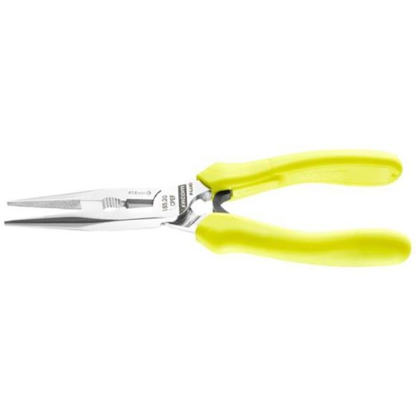 Facom 185.20CPEF er en nebbtang med smale, taggete, rette kjefter som passer til arbeid med kobber- og ståltråd (maks. 160 kg /mm). Leveres med avtakbar returfjær.