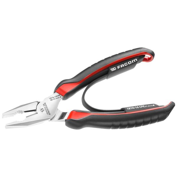 Facom 187A.18CPEPB kombinasjonstang. Tannede plane og ovale rør-/kabelgrepflater kombinert med høytytende skjæregger. Skjæregger utformet for ren klipping av alle typer tråd: myk tråd og moderne materialer opp til en maksimal pianotrådspesifikasjon på 2,0 mm 210 kg/mm². Høy mekanisk sikkerhet takket være forskjøvet nagle og skjæregeometri som reduserer anstrengelsen og kraftbehovet.