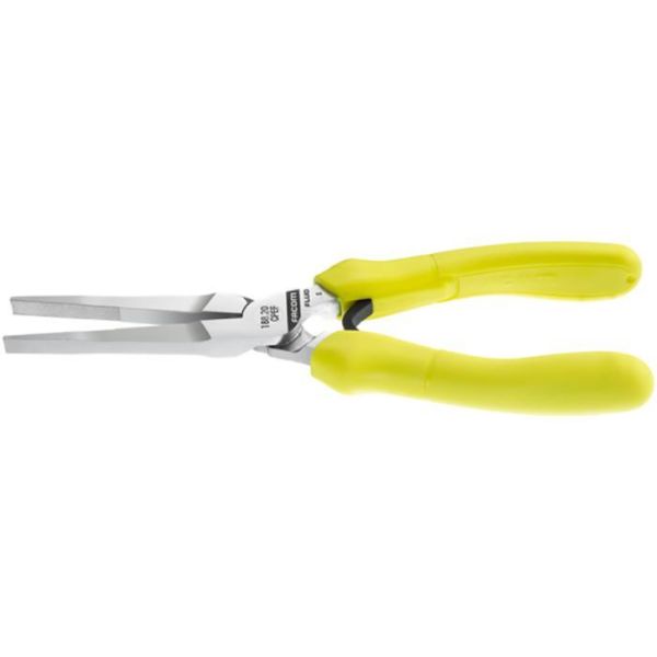 Art.nr: 1911655Forkrommet flattang med fluorescerende håndtak. Fluoresceringen aktiveres av en lampe eller UV-neonlys, og gjør at tangen kan ses i mørke omgivelser fra opptil tre meter. Håndtaket er dessuten kjemikalieresistent. Tangens kjefter er spisse for bruk på trange steder, og rillete for å gi et jevnt grep.