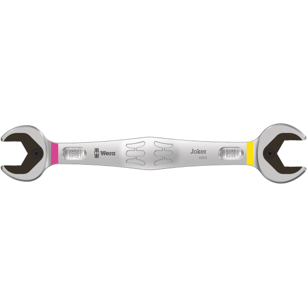 Wera Joker 6002 er en metrisk U-dubbeltnøkkel på 20 x 22 mm som passer for sekskantskruer og -mutre. Med holderfunksjon i form av en metallplate i U-delen, noe som reduserer risikoen for at du mister skruer og mutre. Returvinkelen på bare 30° gjør at man ikke trenger å vri nøkkelen like ofte, og den spesielle, smidde geometrien sikrer høy momentoverføring og høy bøyfasthet.