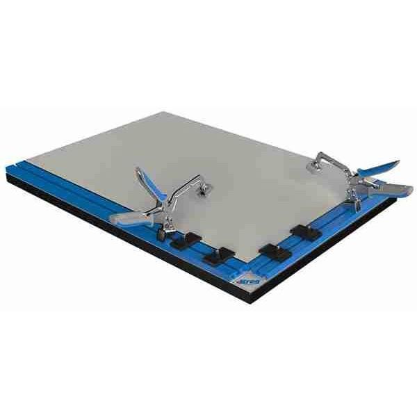 En bordplate med tvingefeste av slitesterk melamin, utstyrt med Automaxx-tvinger og Kregs skinnesystem. Egner seg godt som underlag for et Kreg arbeidsbord. Leveres uten ben.