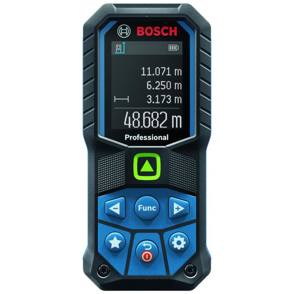 Bosch GLM 50-25 G Professional er en laseravstandsmåler med veldig god sikt takket være en grønn laser, noe som gjør det enklere å justere når du måler lengre avstander innendørs. IP65-klassifisert design gir fullstendig beskyttelse mot støvpartikler og vannstråler, mens det støtabsorberende huset har en fallmotstand på 1,5 m – selv på hard betong. Den har en tilpassbar knapp for å definere favorittfunksjoner eller innstillinger og vibrasjoner for å bekrefte målingene. Det intuitive brukergrensesnittet støtter 30 språk og består av en fargeskjerm med forstørrelsesmodus for mer klarhet.