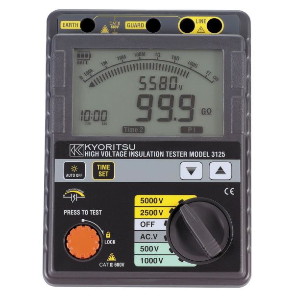 3125 er en ny 5 kV isolasjonstester, utviklet for måling av svært store motstander. Høyspennings isolasjonsmåler som er utstyrt med timerfunksjon for tidsstyrte isolasjonstester, automatisk utladningsfunksjon, samt auto‑avstenging og batteritest. Kyoritsu 3125 viser både prøvespenning og utladningsspenning. Alle verdier kan avleses på det store, belyste displayet, som har både digital visning og analog stolpediagram (bargraf).