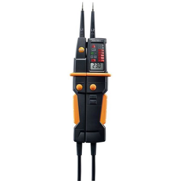 Testo 750-3 er en spenningstester med en stoppkrage for sikkert grep og rundtgående LED-display som kan ses fra alle posisjoner og sikrer en ideell spenningsindikasjon takket være sin unike fiberoptikk. Testo 750-3 har dessuten et LCD-display og oppfyller den seneste standarden for spenningstestere (EN 61243-3:2010). Instrumentet har et område for spenningprøving på 12–690 V og de viktigste funksjonene for spenningsprøving, kontinuitetstesting og måling av roterende magnetfelt. Testo 750-3 er utstyrt med målepunktsbelysning og har triggerfunksjon for jordfeilbryter. I målekategoriene CAT4/600 V CAT3/1 000 V og kapslingsgrad IP64.