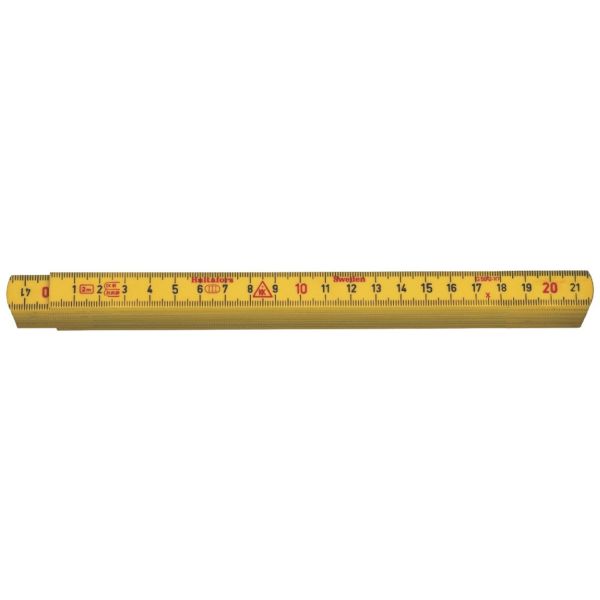 Meterstokk produsert av glassfiberforsterket polyamid som gir økt bestandighet mot fukt. Metrisk gradering i svart på begge sider med røde desimeterverdier.