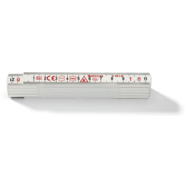 Meterstock laget av glassfiberforsterket polyamid, noe som gir økt motstand mot fuktighet. Metrisk gradering i svart på begge sider og røde decimetertall.
