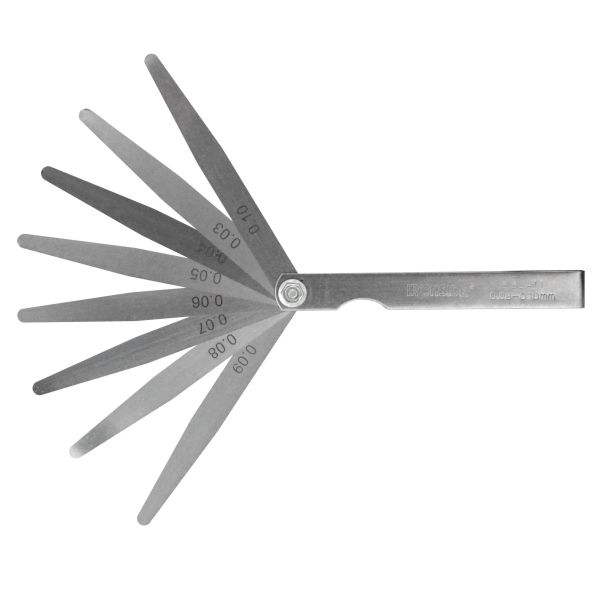 Med polerte blad av herdet fjærstål i millimeterdimensjoner. For måling av slisser, glapp i lager etc. Med forniklet, låsbar holder.