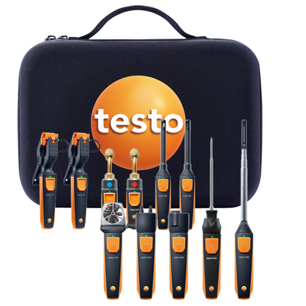 Settets inneholder et komplett utvalg smarte måleinstrumenter fra Testos SmartProbes-serie – blant annet høytrykkssensorer, rørtemperaturgivere, fuktgivere, IR-termometer, differansetrykkmåler og anemometre. Alle instrumentene er trådløse og kommuniserer sømløst via Testo-appen med en rekkevidde på opptil 100 m.