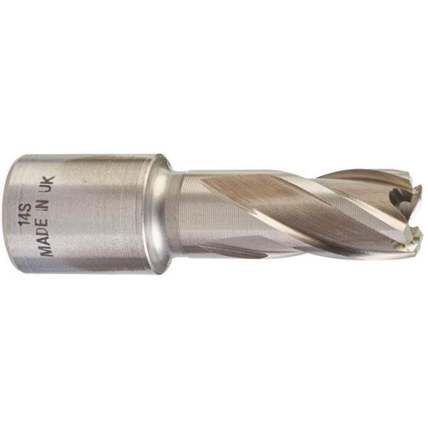 Kjernebor med Weldon-feste og en diameter på 14 mm til å bore i metall.