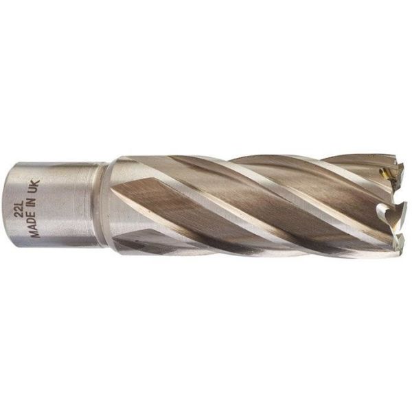 Art.nr: JZ12139-9Kjernebor med Weldon-feste og en diameter på 22 mm til å bore i metall.