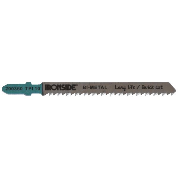 10 TPI. Stikksagblad for raske snitt. Tanning i bimetall av høy kvalitet. Frivinkel-, tannslipt. For hardt tre, laminat og laminatplater/HPL: 3 – 30 mm samt fiberplater og plast/epoksy. Bimetall M51. Long Life. Total lengde: 100 mm. Bredde: 8 mm. Tykkelse: 1,5 mm 5 stk/pakning