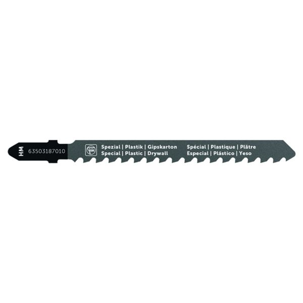 Høykvalitets stikksagblad med hardmetallspiss, egnet for abrasive materialer, fiberarmert plast (CFRP/GFRP), epoxy, sementfiberplater, lettbetong og gipsplater. Gir rette kutt og har svært lang levetid.