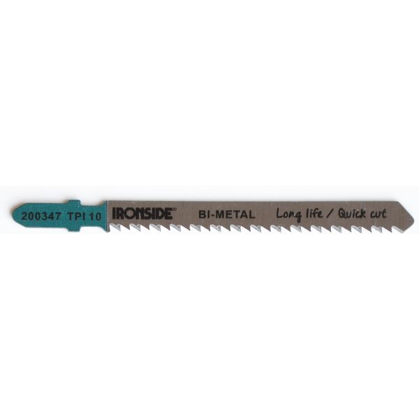 10 TPI. Stikksagblad for raske snitt. Tanning i bimetall av høy kvalitet. Standard for tre: 3 – 30 mm For rett og fin saging i myke treslag, sponplater, plywood og laminat- og fiberplater. Frivinkel, tannslipt. Bimetall M51. Long Life. Total lengde: 100 mm. Bredde: 8 mm. Tykkelse: 1,5 mm 5 stk/pakning