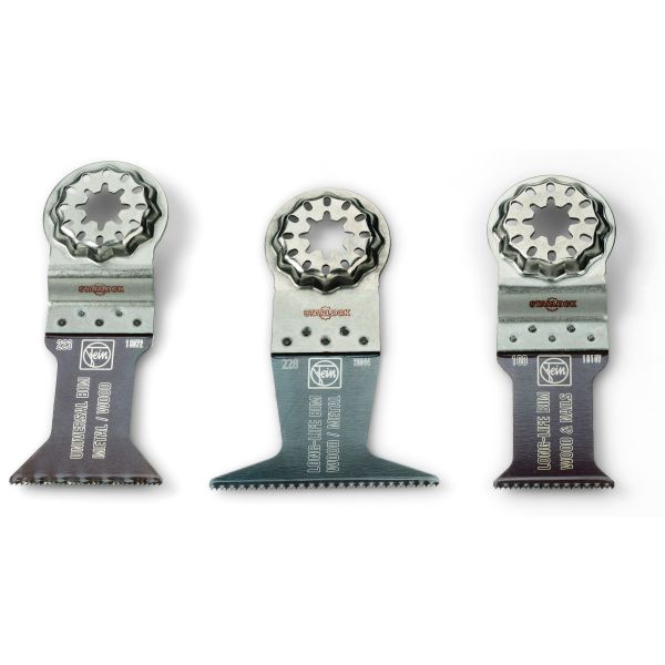 Sagbladsett med tre E-Cut senkesagblad for saging i tre og metall. Sagbladene passer til alle FEIN MultiTools samt alle andre vanlige MultiTools med Starlock-feste.