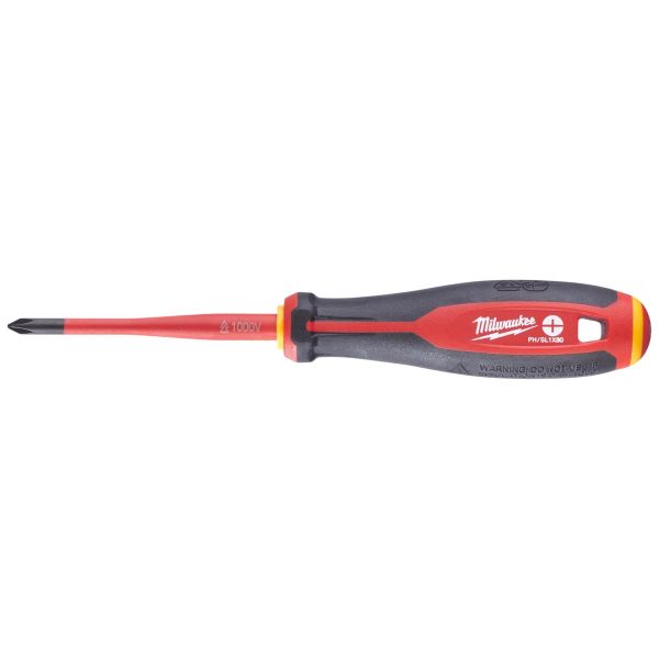 Milwaukee Tri-Lobe VDE er en skrutrekker som er VDE-testet til 10 000 V og garantert til 1000 V. Skrutrekkeren har en smal akseldiameter for tilgang til lavtliggende skrueapplikasjoner og et praktisk Tri-Lobe-håndtak som er optimert for maksimal brukerkomfort og applikasjoner med høyt dreiemoment. Verktøyet har permanent synlige ID-markeringer for rask verktøyidentifikasjon og hull for verktøysikring. Håndtaket er 3-sidet for å forhindre rulling.