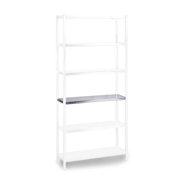 Fire stolper til Raaco hyllesystem bestående av separate stolper og hylleplater av galvanisert stål. Kan monteres på alle stolpenes sider, noe som gjør at systemet kan bygges ut både i lengden og dybden. Enkel og stabil montering uten krysstang. Hylleplaten fastmonteres i stolpens ferdige skruehull med et beslag og skrue i hvert hjørne. Stolpene er 1 m høye og kan skjøtes sammen til 2 m. Hylleplatene er flyttbare i intervaller på 25 mm. Hyllekant på hyllen for å holde detaljene på plass. Bærekraft 120 kg.