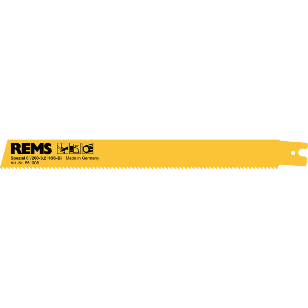 REMS spesialsagblad på Ø6"/lengde 260 mm samt tanndeling på 3,2 mm. For stålrør ≤ 6". Skråstilt tanning for rolig snitt ved liten tanndeling.