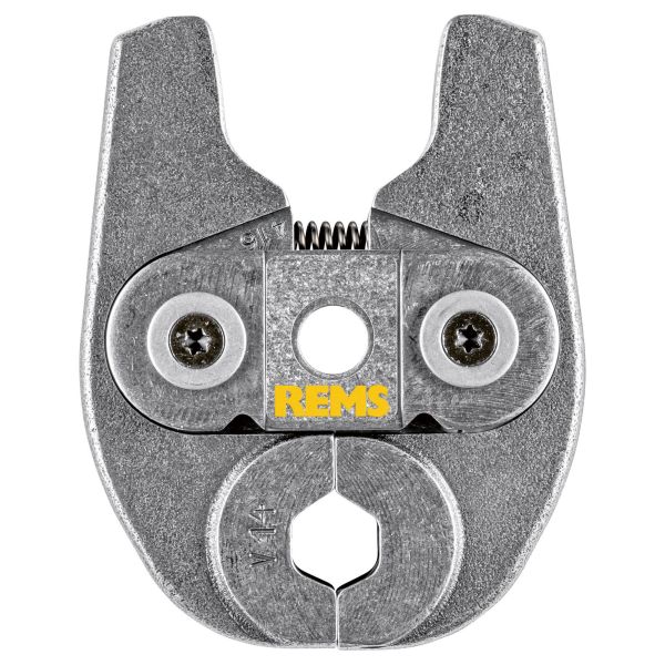 REMS 578326 Mini er en svingbar monoblokkpressbakke med V-kontur av type V 14 (PZ-2B). Pressbakken har en svært slitesterk og kompakt konstruksjonsform samt lav vekt takket være en spesiell utførelse av presstangtilkoblingen. Drift med REMS Mini-Press ACC, REMS Mini-Press 22 V ACC. Presskonturene er systemspesifikke og tilsvarer presskonturene i respektive pressmuffesystem. Dermed feilfri systemkonform og sikker pressing. Pressbakken har en svært presis og maskinelt nøyaktig CNC-bearbeidet avrundet presskontur. Dermed betydelig lavere produksjonstoleranser sammenlignet med en presskontur som kun er støpt.