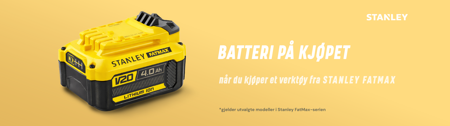 Kjøp et hvilket som helst 18V Stanley FatMax V20-produkt oppført i kampanjen mellom april og juni og få et ekstra 4,0 Ah-batteri. Kampanjen har et begrenset antall batterier. Først til mølla-prinsippet gjelder. Kun 1 batteri per kunde.